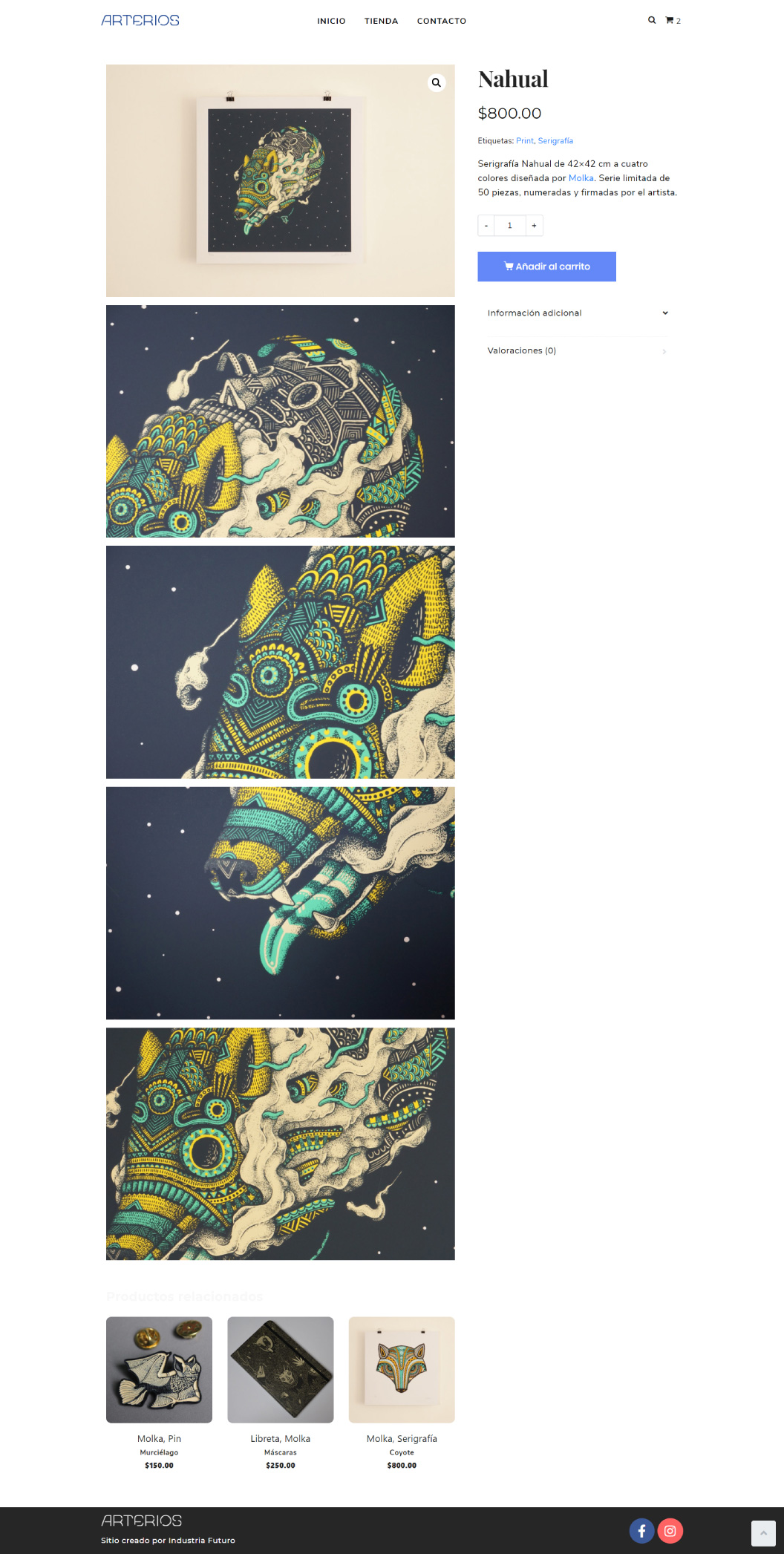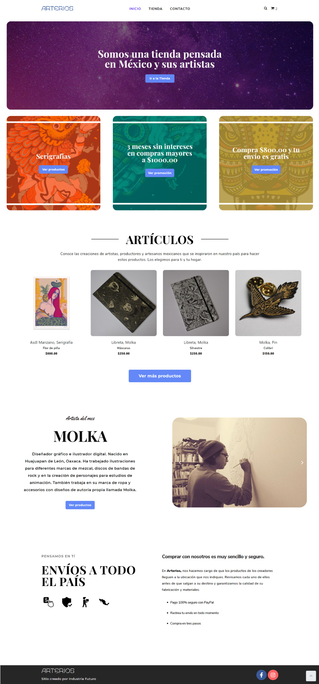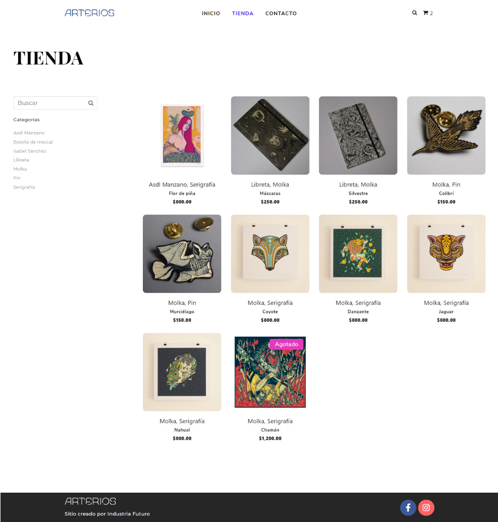 El diseño de la tienda en línea fue pensado para verse simple, buscando resaltar los productos de cada artista. En el desarrollo nos enfocamos en brindar un servicio seguro para las transacciones y en la creación de espacios exclusivos para los productos de cada artista.